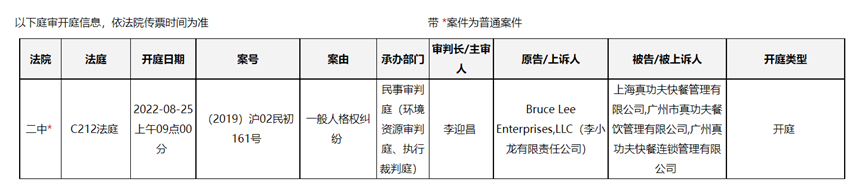 上海市高级人民法院官网显示,这起诉讼的原告是李小龙有限责任公司,注册地在美国加利福尼亚州,法定代表人是李香凝。被告是上海真功夫快餐管理有限公司、广州市真功夫餐饮管理有限公司、广州真功夫快餐连锁管理有限公司。案由是“一般人格权纠纷”。