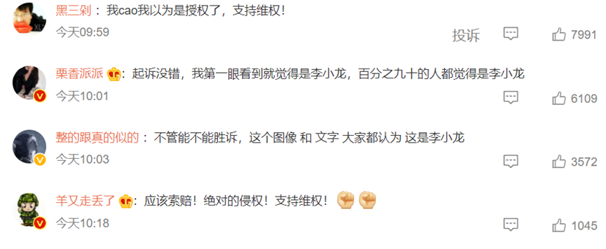 截至发稿,庭审还未出结果。不过从网上的呼声来看,大多数网民是支持维权的。不少网友表示“第一看看到就觉得是李小龙”、“不管能不能胜诉,这个图像和文字大家都认为是李小龙”、“以前在外边看到真功夫快餐,其商标上的人物形象看起来就是李小龙,原来没有获得肖像权使用权”。