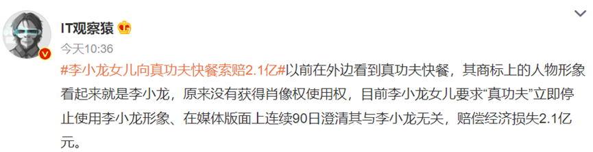 据公开资料,李香凝的公司认为,公司合法享有李小龙相关的各种权益,已陆续在中国大陆注册近60个与李小龙相关的商标。而“真功夫”擅自使用李小龙肖像,既侵犯了李小龙肖像上承载的人格尊严,也侵犯了财产上的利益。因此将真功夫告上法庭。