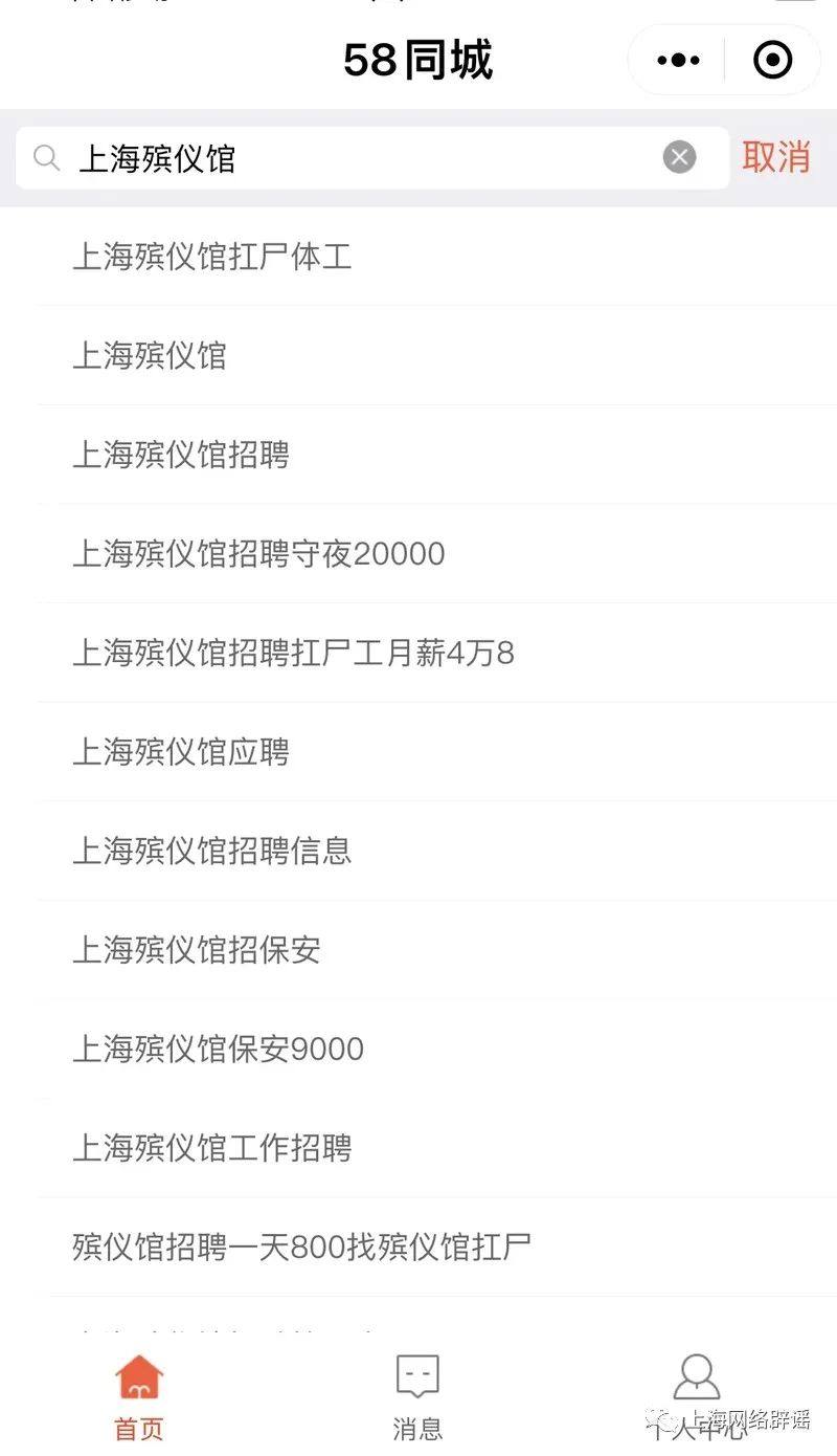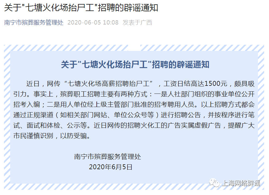 日前,“河南新乡一女子称在殡仪馆上班一晚挣1600元”的言论被河南省新乡市殡仪馆辟谣。上海辟谣平台注意到,类似的消息在互联网上已传播多年。2019年5月,网上曾流传消息称“深圳市宝安区殡仪馆招聘流动式扛尸搬运工,要求胆大的男性。白班800/天,晚班1600/天,日结。”深圳市民政局对此公开辟谣,宝安区未设立殡仪馆,接运遗体的单位也未向社会发布网传招聘信息。2020年6月,网传“七塘火化场招聘抬尸工,日结工资高达1500元”。对此,南宁市殡葬服务管理处发布声明称,网传消息系谣言。普通人较少接触殡仪馆,或许才让“殡仪馆高薪”或“殡仪馆招聘”类信息备受关注。那么,事实究竟如何?记者进行调查发现,这类消息以挂羊头卖狗肉居多,不足为信。记者在知名搜索网站和招聘网站上输入“上海殡仪馆”“上海火葬场”,搜索栏会自动匹配出相应的历史搜索记录,包括“上海殡仪馆招聘扛尸工月薪4万8”“上海殡仪馆招聘守夜20000”“上海火葬场招聘1300一天”等内容。但点击进去,或是无法找到相关信息,或是普通的白事服务公司广告,根本不是招聘信息。记者咨询了其中几家白事公司,都表示目前不招人。据一位曾在白事公司工作过的人透露,市场上有很多白事一条龙服务公司,主要提供中介服务,即协助丧家与殡仪馆进行对接,并提供衣服、花篮花圈、骨灰盒、打印照片等一系列殡葬服务,费用根据丧家的要求有所不同。如果一切从简,一整套流程走下来,收费也要在1000元左右。在白事公司工作,具体收入不固定,要看公司业务量,生意好时一天大概能挣五六百元。既然招聘信息不是这些白事公司发布的,又是谁发的呢?记者致电上海市龙华殡仪馆、上海市宝兴殡仪馆、上海市益善殡仪馆,工作人员都表示目前没有对外招聘,也没有发布过类似“一天xx元”等网传招聘信息。业内人士指出,殡仪馆大部分属于事业单位。目前,上海各大殡仪馆都是严格按照国家法律法规要求,签订聘用合同或劳动合同,工资严格按照市人社局规定的标准发放,不存在“日结”这种用工形式。所谓“招聘xx职位,日结过千甚至过万”完全是谣传。据记者了解,上海市共有15家殡仪馆,由上海市、区民政局统一管理。殡仪馆招聘渠道主要有三种:三是通过“上海公共招聘(官网:http://jobs.rsj.sh.gov.cn)” 进行招聘。白事公司没有招聘、殡仪馆也没有招聘,网络上的“日结工资xx元”等信息又为何存在?从调查看,或许是不规范的职业中介用来吸引求职者的“诱饵”。殡仪馆的工作比较特殊,有人凭直觉认为这个行业的收入待遇应该会很高。一些中介公司为了“引流”,不惜炮制出数千元的日薪,目的就是将求职者吸引过来,进而赚取中介费。至于能不能拿到这么高的薪酬,就要打个问号了。另外需要提醒的是,日结工资没有任何保障。因为不签合同,没有工资单,所以如果在工作中出现工伤、纠纷等情况,公司不会承担法律责任。所以,请求职者们擦亮眼睛,不要轻信“日结工资xx元”等信息,尽量选择正规的招聘平台和公司。