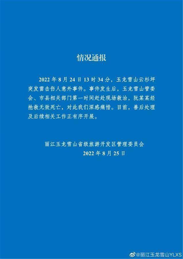 25日中午12时许,玉龙雪山管委会通报,24日13时34分,玉龙雪山云杉坪突然雷击伤人意外事件,阮某某经抢救无效死亡。