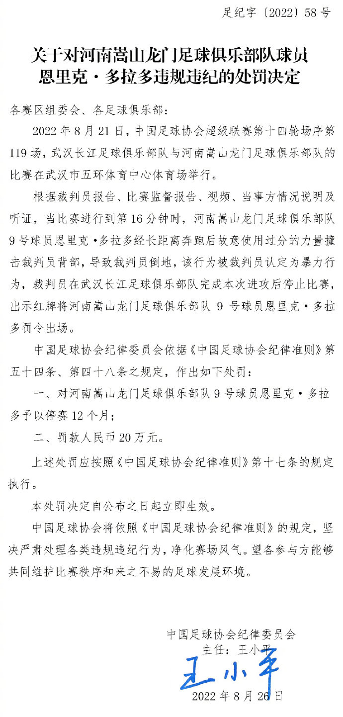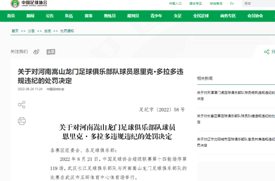 在日前举行的中超第14轮比赛中,河南嵩山龙门队的外援多拉多从背后撞击当值主裁马宁,被红牌罚下。
