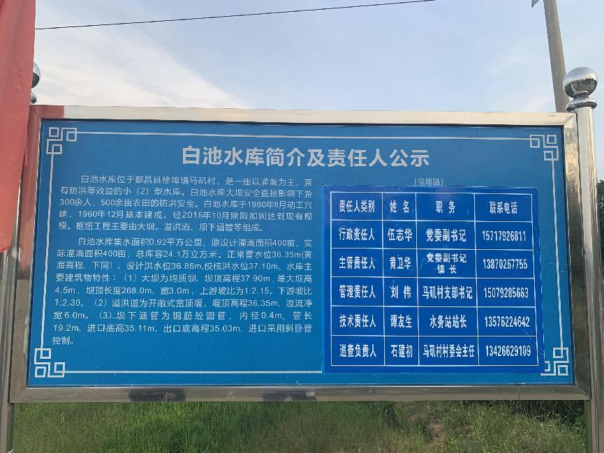 在白水塘水库边上,一块简介牌上这样清清楚楚的写道:白池水库位于都昌县徐埠镇马矶村,是一座以灌溉为主,兼有防洪等效益的小二型水库。白池水库集水面积1380亩,原设计灌溉面积400亩,实际灌溉面积400亩,总库容24.1万立方米。据石国宝儿子石洋华所说,白水塘水库本来预计只为石矶村(包括石松岗村、石楼下村、石才村)提供水源用来灌溉,可实际上呢?