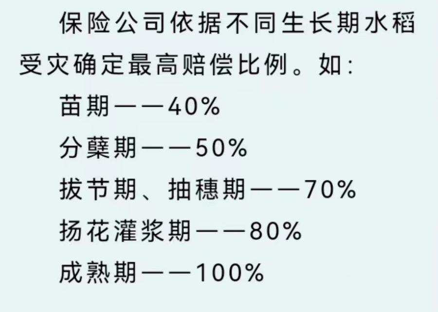 石国宝在咨询了中国人寿保险公司后,保险负责人给他发了一张赔偿比例图片。按照石国宝买的中国人寿保险的赔偿条例来看,水稻苗期受灾赔偿40%;分蘖期受灾赔偿50%;拔节期、抽穗期受灾赔偿70%;扬花灌浆期受灾赔偿80%;成熟期受灾赔偿100%。“水稻“怀孕”了才能全额赔1100,我还有960亩晚稻还在分蘖期咧。”石国宝有些失望的说道。旋即他又感到几分庆幸,幸亏买了中国人寿农业保险,能降低一部分损失,而随着水库干涸,水稻无水可以灌溉,基本已经停止生长,随着石国宝的指引,正观新闻记者看到,他所种下的“一季晚”水稻部分已经旱死。