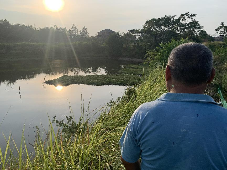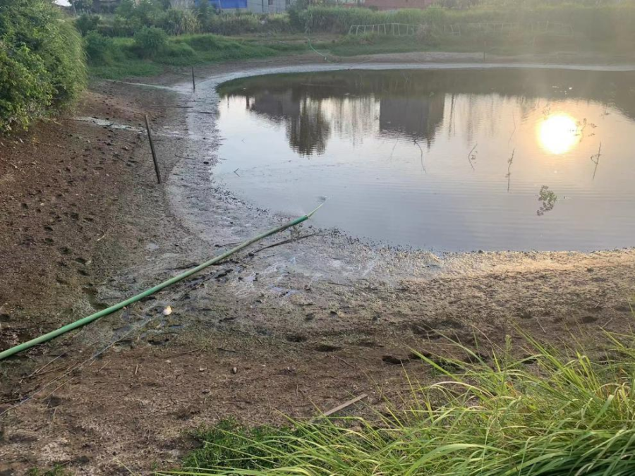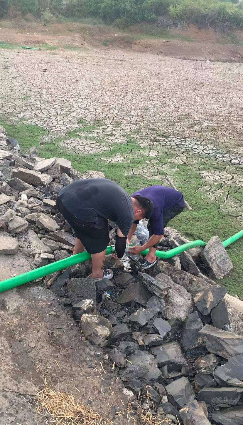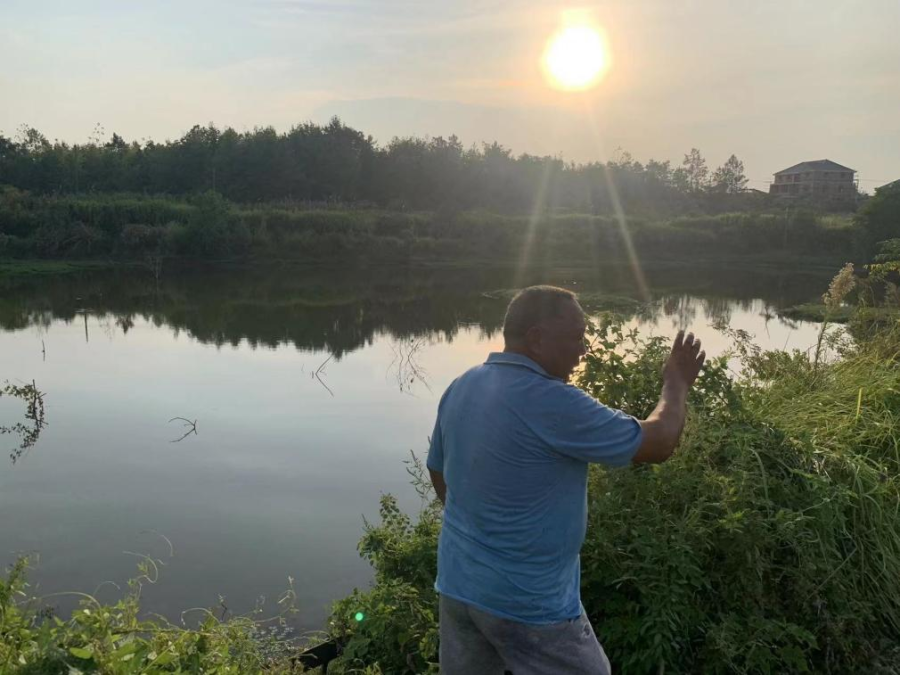 不多时,石国宝的哥哥石国平来到了白水塘水库边上,“来看看我这边不?”看到记者点头后石国平走向了水库另一面他所承包的鱼塘。据了解,石国宝一共兄弟五人,石国宝是家中最小的弟弟,石国平家中排行老二,老大年纪大了已经停止劳动,其他兄弟在徐埠镇上做些小买卖。随着石国平的指引,我们可以看到鱼塘的水已经在被抽取到弟弟石国宝的田地中用来灌溉。“从来没这么旱过,先把这几天熬过去再说。”石国平一边和记者解释一边哄着撒娇要回家看电视的小孙女,“听话,等两分钟就回家。”