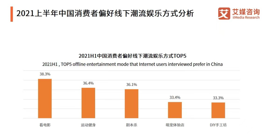据统计,在2021年上半年中国消费者偏好的线下潮流娱乐方式中,剧本杀以36.1%排名第三,仅次于看电影(38.3%)和运动健身(36.4%)。相比于电影、运动等传统娱乐方式,剧本杀虽然风光不再,但还是有着不可比拟的沉浸属性和社交属性。
