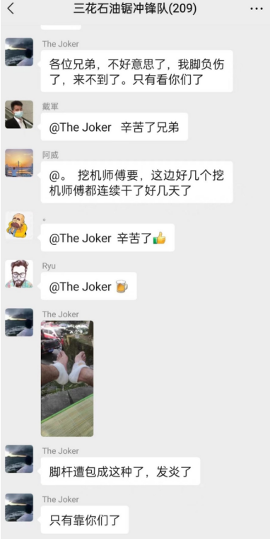 三花石油锯冲锋队的群聊消息记录下了他们救火的艰辛,一位志愿者的脚在救援过程中负伤,无奈退下战线,“各位兄弟,不好意思,我脚负伤来不到了,只有看你们了!”