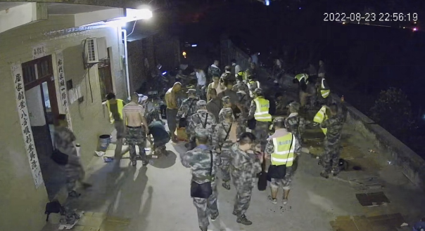 23日晚,璧山区七塘镇喜观村95岁王明芳家的铁栅栏外挤满了武警官兵,这里距离缙云山20多公里,他们在门口喊道,“老人家,我们想借地休息一下。”老人开了门,这群从火线回来的武警官兵席地躺下,房前屋后,甚至屋外的水沟旁都睡满了人。