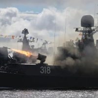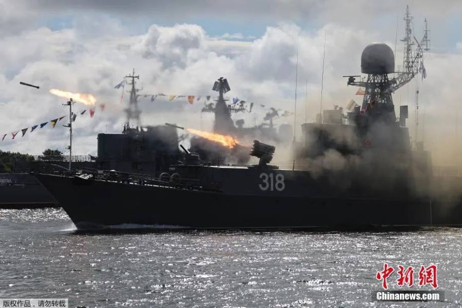 当地时间7月28日,俄罗斯波罗的海舰队基地举行海军节阅兵总彩排。图为一艘军舰发射反潜火箭。