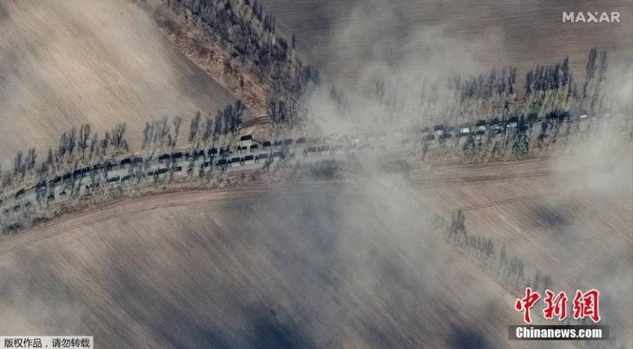 当地时间2月27日,卫星图像显示俄罗斯军车车队在伊万基夫郊区路上,向乌克兰首都基辅移动。