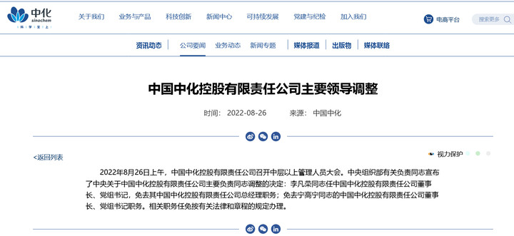 据中国中化控股有限责任公司官网消息,8月26日上午,中国中化控股有限责任公司召开中层以上管理人员大会。中央组织部有关负责同志宣布了中央关于中国中化控股有限责任公司主要负责同志调整的决定:李凡荣同志任中国中化控股有限责任公司董事长、党组书记,免去其中国中化控股有限责任公司总经理职务;免去宁高宁同志的中国中化控股有限责任公司董事长、党组书记职务。相关职务任免按有关法律和章程的规定办理。
