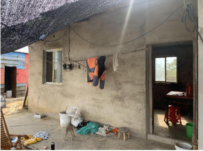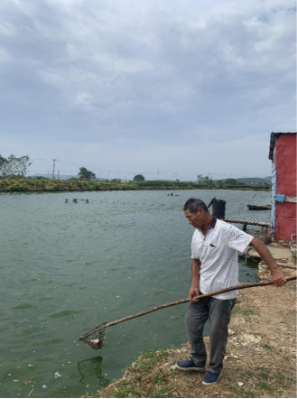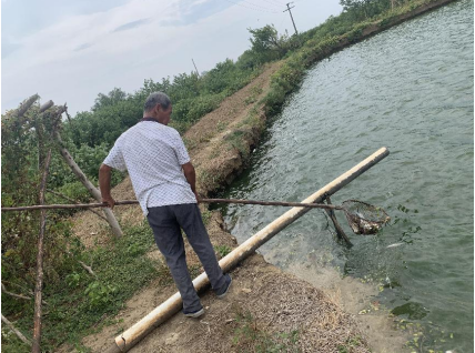 说着邵火金拿起了房屋门口的渔网,走到了另一个鱼塘边上。“这么大一条有两斤多呢!”邵火金举起渔网捞起塘中的死鱼愁苦的说道。