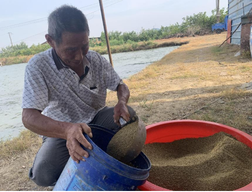 就在记者与邵火金交谈的时候,一位骑着电动车戴着头盔的中男子来到了附近,据了解,他是来自矶山湖水产养殖场的工作人员,前来给邵火金送一些治疗鱼苗的相关药物。工作人员从车上拿下一桶药物,这让邵火金紧皱的眉头舒展开了一些,在说明了药物数量和相关用法后,详细询问了鱼塘近况。从邵火金那里得知,大旱后,每周矶山湖水产养殖场会定点来送相关药物,这让邵火金更加体会到“背靠大树好乘凉”的好处。
