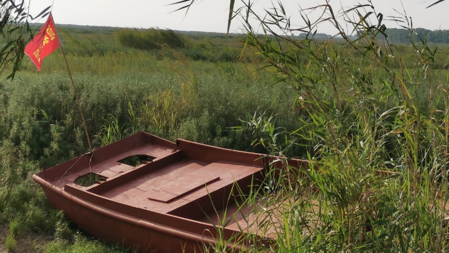 不远处的公路尽头就是君山岛。这是一座本该被广阔水域环绕的小岛,如今已经完全和湖堤连接在一起。正观新闻记者在走访中发现,原本广阔的航行河道在水草的包围下显得异常狭窄,不时就可以看到掩在水草深处的船只。据当地村民介绍,洞庭湖周边几公里的河道基本都已经断流了,只剩下个别还未完全干涸的水塘,村民的小船平时停在河道边,现在却都搁浅了。
