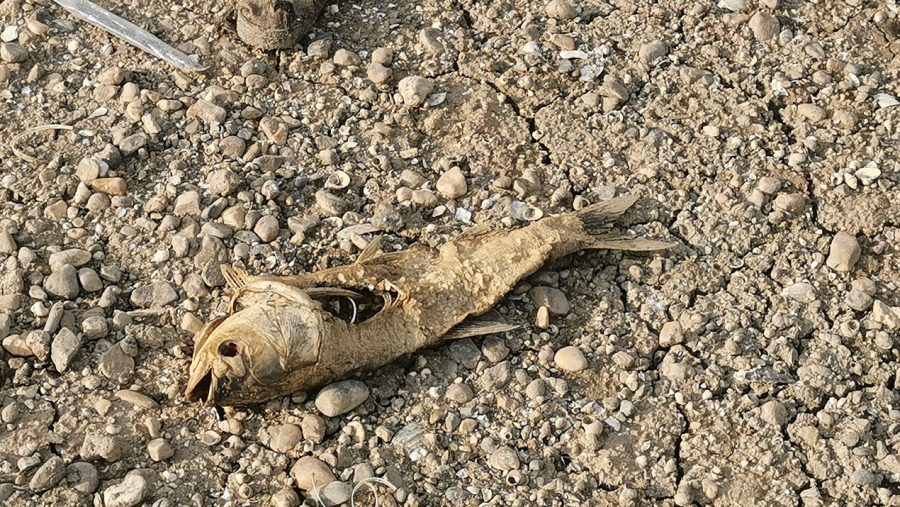 在与渔政部门进行沟通时,记者得知当地渔政工作人员已经安排了大量的人员在洞庭湖附近的水域进行巡查,有许多尚未完全干涸的水塘中,鱼类大量搁浅,在持续的高温下非常容易死亡,因此工作人员必须发现死鱼后及时进行打捞,再将死鱼集中进行掩埋,以免对水质造成更严重的污染。