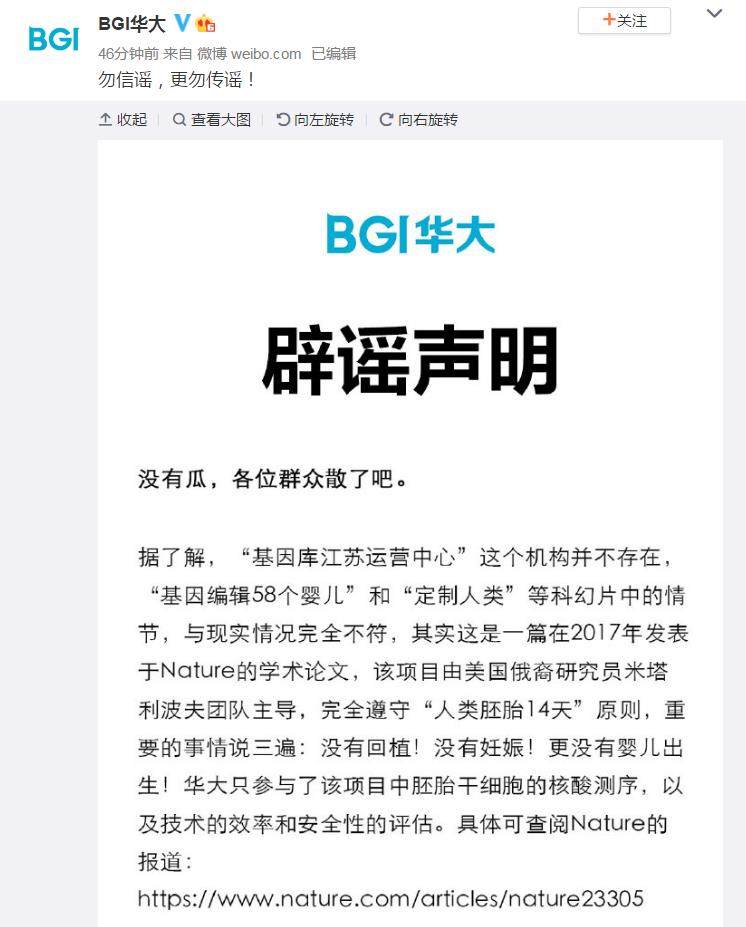 基因编辑58个婴儿?华大基因:与现实完全不符