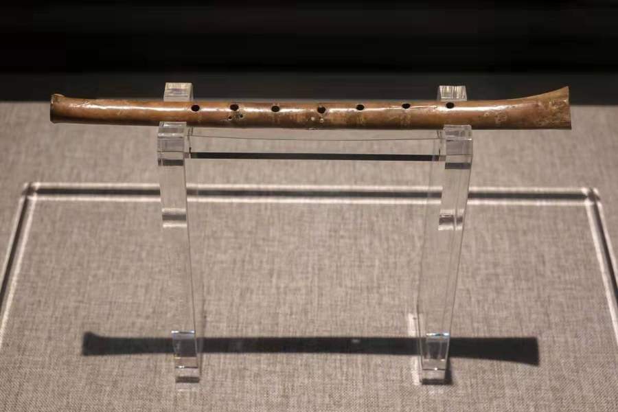 与其他文物不一样的是,作为一件乐器,你不仅可以看到我,还可以听到我。我是由仙鹤翅骨制成的骨笛,在贾湖遗址出土的20多支骨笛中,有5孔、6孔、7孔,还有8孔骨笛。经过测试,我可以奏出六声音阶的乐音,音色明亮古朴,我的声音跨越了几千年进入你们的耳朵。