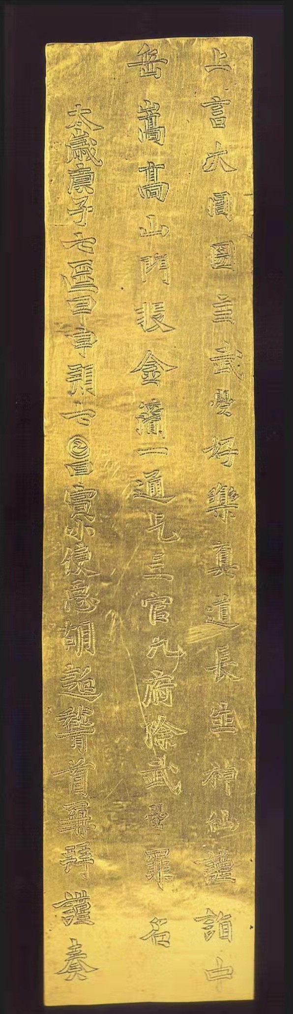 大家好,我是武则天金简。我是长方形,长36.5厘米,宽8厘米,厚不足0.1厘米,重233.5克,正面镌刻文字63个。是唐代女皇武则天渴望成仙长生不老而派使者向中岳嵩山山门投递祭拜之物。