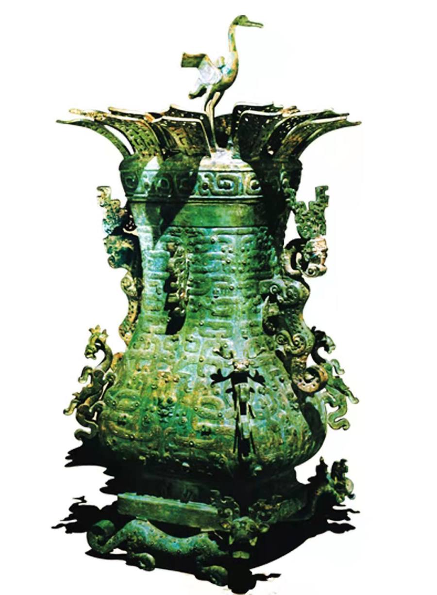 之所以名字里有“鹤”,是因为在壶盖上方有一只仙鹤昂首站立。要在壶上立一只仙鹤很轻松,但是像我这么精致可就难了。从制作工艺上看,莲鹤方壶的铸造采用了圆雕、浅浮雕、细刻、焊接等多种技法,工艺十分精湛。并且壶的纹饰细腻,设计复杂,铸造精美,不仅反映了春秋时期的时代风貌,也展现了春秋时期郑国的工业科技水平。