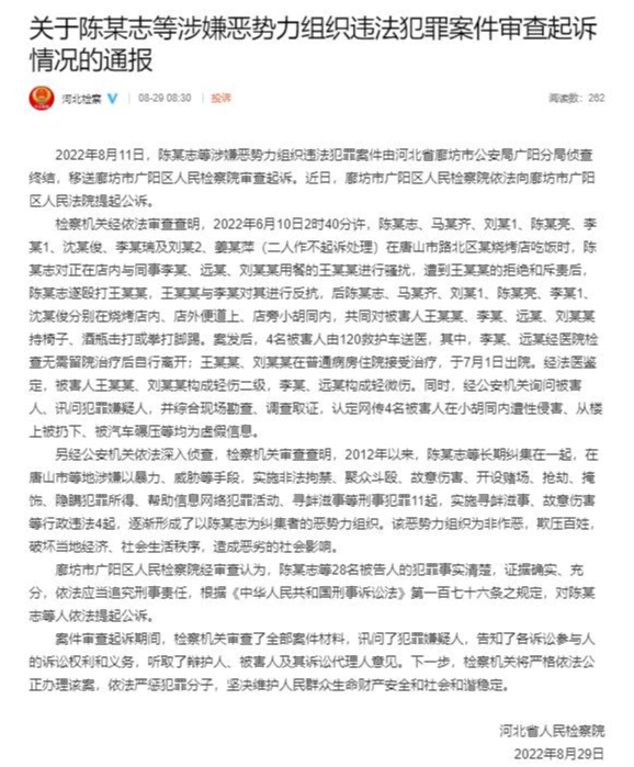 8月29日,河北省人民检察院和纪检监察机关相继发布通报。时隔两个多月,唐山烧烤店围殴事件终于有了最新进展。