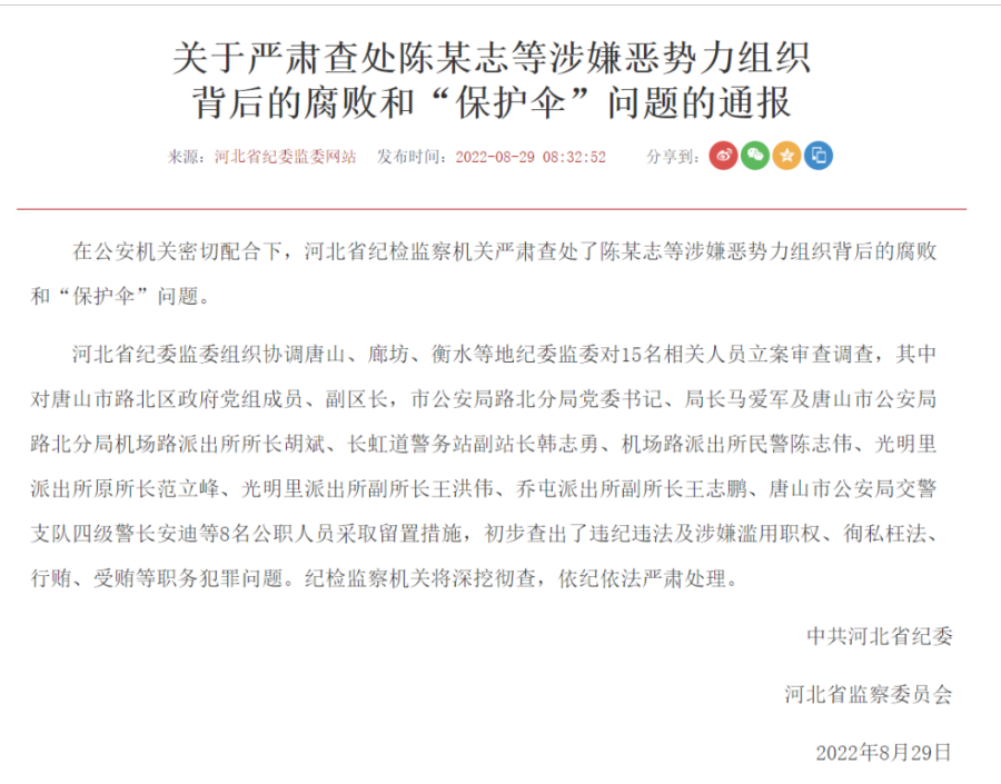 时至今日,陈某志等人骚扰他人遭拒,随后大打出手、暴力相加的场景依然让人觉得触目惊心。也正是因为他们恶意伤人时的狠毒、狂妄和嚣张,以及唐山警方的前后回应不一,引发了舆论场上对其“惯犯身份”以及背后保护伞的质疑。而这两份通报也印证了公众的猜想。