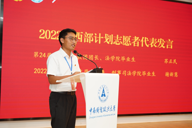 △ 苏正民作为西部计划志愿者代表发言(中南财经政法大学供图)