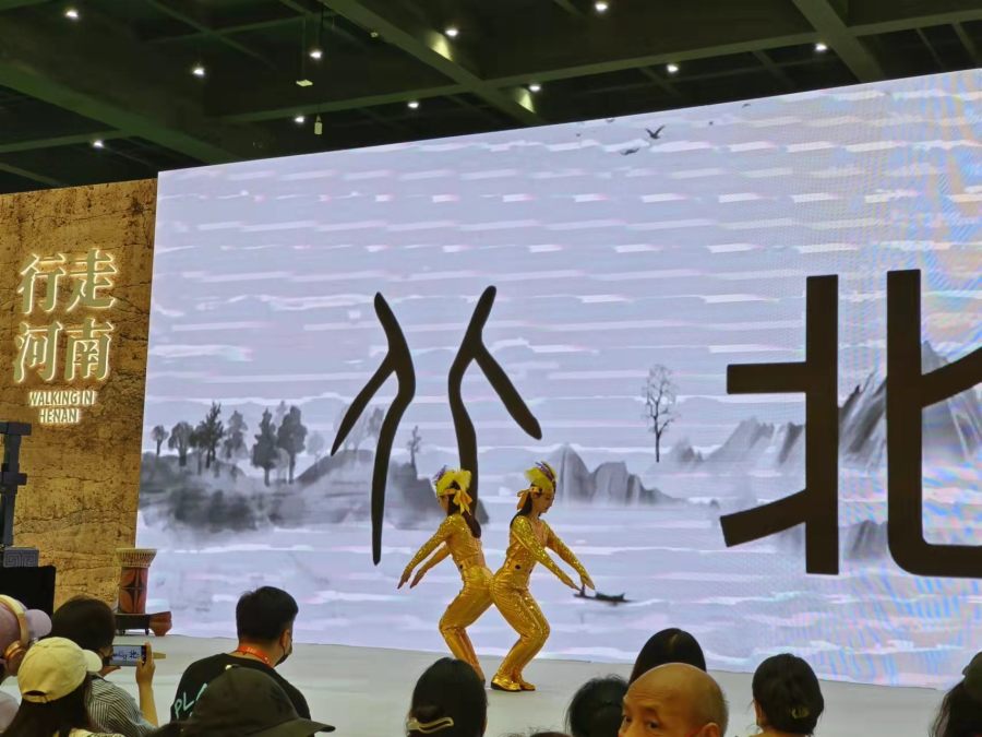 早上9点40分,“行走河南 读懂中国”主题区入口处的一个表演台上就围满了观众,歌舞《甲骨文字秀》开始演出。演员们用肢体动作呈现出“人”“北”“天”等甲骨文字,配上清晰的旁白解说,让观众在短短几分钟内领略到中国汉字的独特魅力。