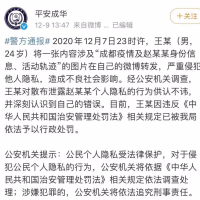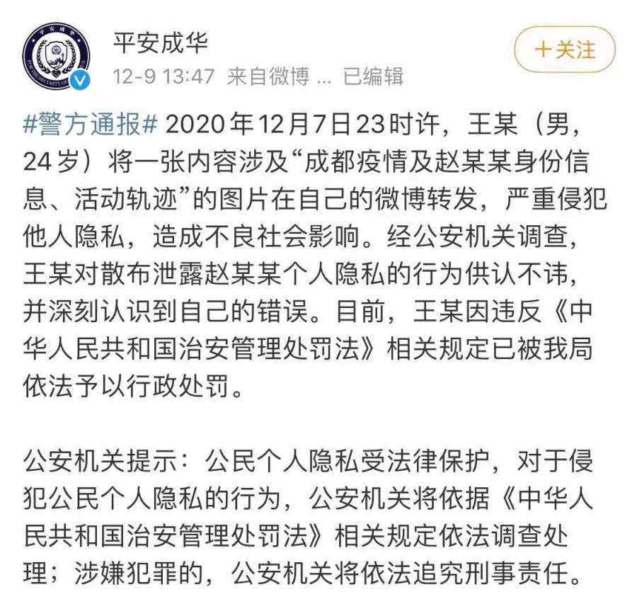 12月9日,成都市公安局成华区分局发布通报称:2020年12月7日23时许,王某(男,24岁)将一张内容涉及“成都疫情及赵某某身份信息、活动轨迹”的图片在自己的微博转发,严重侵犯他人隐私,造成不良社会影响。