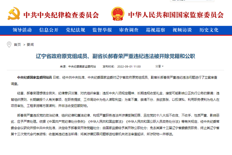 辽宁省政府原党组成员、副省长郝春荣严重违纪违法被开除党籍和公职日前,经中共中央批准,中央纪委国家监委对辽宁省政府原党组成员、副省长郝春荣严重违纪违法问题进行了立案审查调查。 经查,郝春荣理想信念丧失,纪律意识淡薄,对抗组织审查;违反中央八项规定精神,长期违规收受礼金,接受可能影响公正执行公务的宴请;违背组织原则,长期瞒报个人有关事项,在职务提拔、工作调动中为他人谋取利益;为官不廉,亲清不分,贪欲膨胀,以权谋私,利用职务便利为他人在项目审批、工程承揽等方面谋利,并非法收受巨额财物。 郝春荣严重违反党的政治纪律、组织纪律和廉洁纪律,构成严重职务违法并涉嫌受贿犯罪,且在党的十八大后不收敛、不收手,性质严重,影响恶劣,应予严肃处理。依据《中国共产党纪律处分条例》《中华人民共和国监察法》《中华人民共和国公职人员政务处分法》等有关规定,经中央纪委常委会会议研究并报中共中央批准,决定给予郝春荣开除党籍处分;由国家监委给予其开除公职处分;免去其第十三届辽宁省委委员职务,终止其辽宁省第十三次党代会代表资格;收缴其违纪违法所得;将其涉嫌犯罪问题移送检察机关依法审查起诉,所涉财物一并移送。中央纪委国家监委驻国家安全部纪检监察组原组长、国家安全部原党委委员刘彦平严重违纪违法被开除党籍和公职