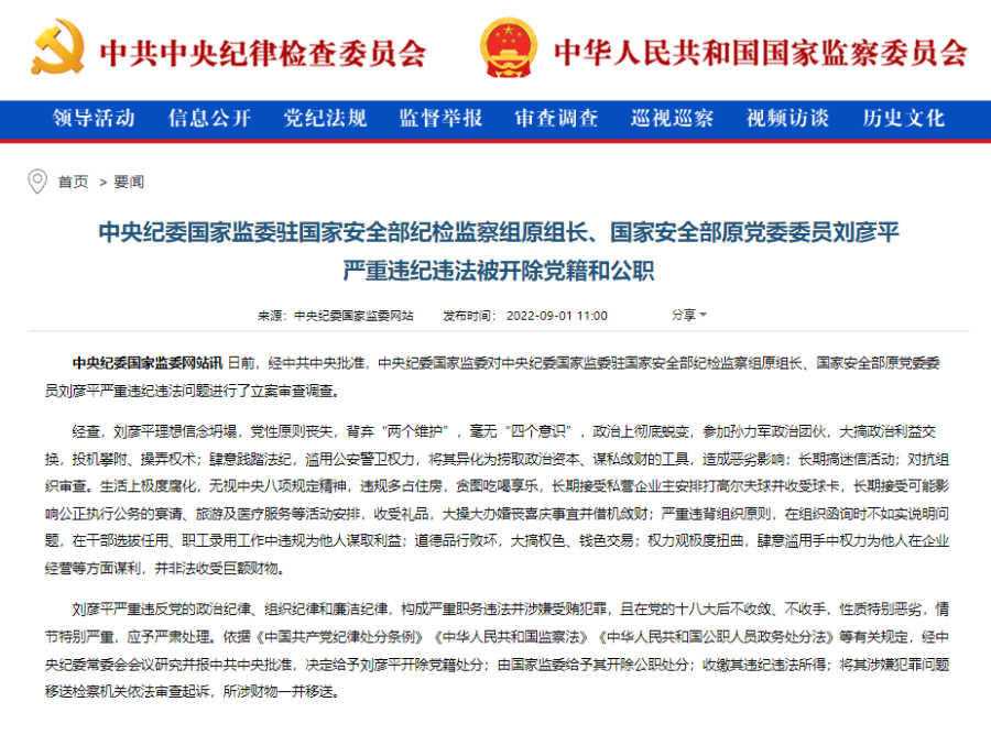 日前,经中共中央批准,中央纪委国家监委对中央纪委国家监委驻国家安全部纪检监察组原组长、国家安全部原党委委员刘彦平严重违纪违法问题进行了立案审查调查。