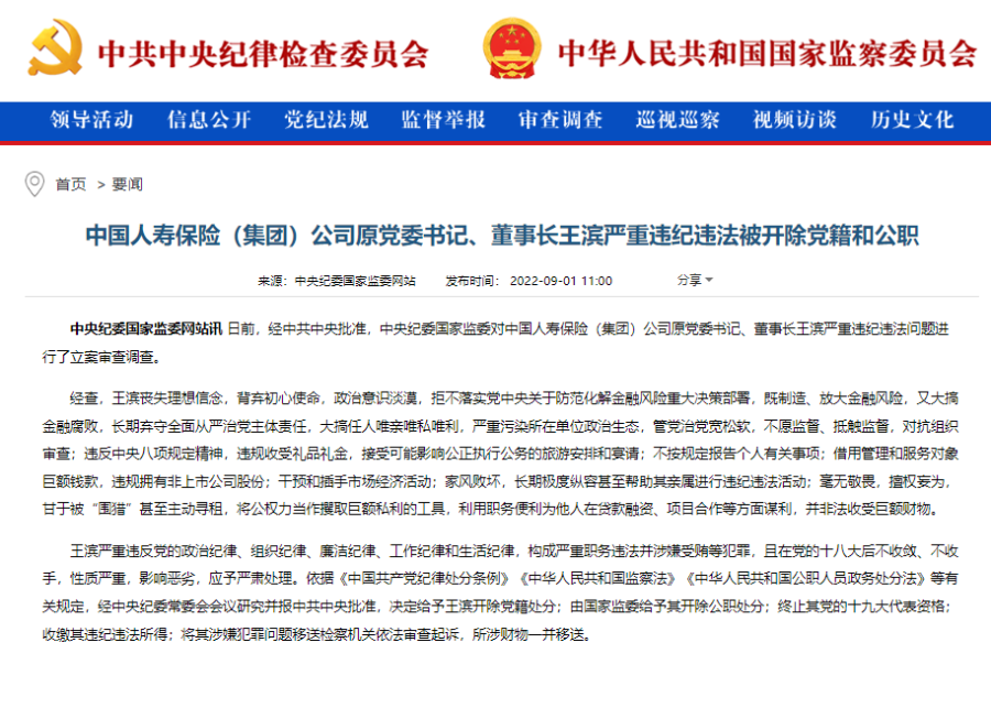 日前,经中共中央批准,中央纪委国家监委对中国人寿保险(集团)公司原党委书记、董事长王滨严重违纪违法问题进行了立案审查调查。