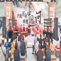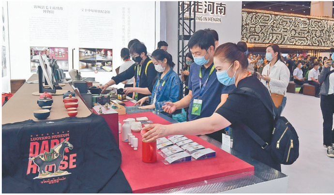 在郑州大河村遗址博物馆展台,该馆馆长胡继忠正在与工作人员一起向观众发放宣传手册。“我们这次为大家带来了不少与大河村文化相关的文创产品,希望更多人了解缤纷多彩的大河村文化。”胡继忠告诉记者。