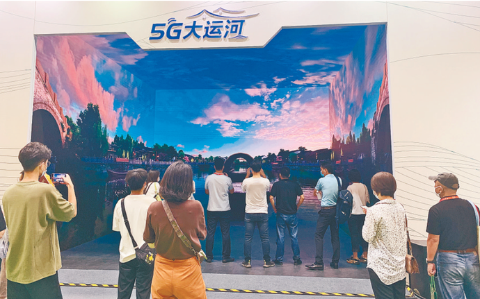 在中国大运河博物馆展厅,“5G大运河”体验馆吸引大量观众亲身体验。在这个体验馆中,除了观众所在一侧之外,天花板、地板和三面的墙壁,全部由LED大屏铺就,体验馆采取5G全息投影技术,给观众带来全沉浸式的体验。