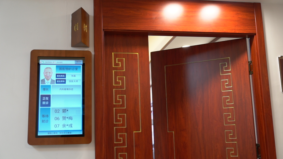 7点半,诊室门外的指示灯亮起,上面写着“国医馆01诊室”,早已有患者排队等候在门前。93岁的他穿上白大褂,左侧胸前佩戴着党员徽章,他的眼睛有神,挺拔的鼻梁上架着黑框眼镜,双手交叉,身体微微前倾,开始了新一天的诊疗。