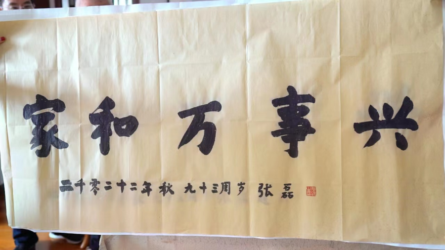 桌角的一侧存放着书画卷轴和用过的宣纸,谈及书法,这位93岁的老人兴致盎然,他取出刚刚写就的一幅字“家和万事兴”。泛黄的宣纸上,这五个字遒劲有力,散发着淡淡的墨香,“这是我给老友的作品,还没有装裱,日常生活中我也喜欢书法”,老人慢慢说道。