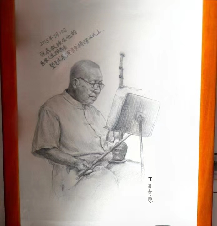 他背过身去,静静地望着面前那幅素描画像,画面上老人穿着素净的中式短袖,嘴角轻轻上扬,左手扶琴,右手拉弦,安静平和,恍惚间耳畔传来“花篮的花儿香,听我来唱一唱,唱呀一唱,来到了南泥湾;南泥湾好地方,好呀地方;好地方来好风光,好地方来好风光……”