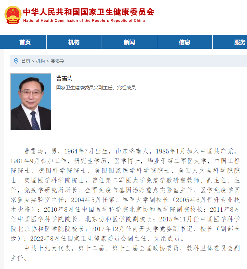 曹雪涛任国家卫健委副主任,曾任南开大学校长