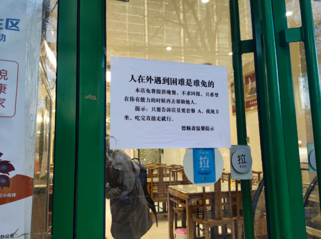 “人在外遇到困难是难免的,本店免费提供晚餐……只要向店员报出暗号‘A套餐’,找地方坐,就可以享用一碗热气腾腾的红烧牛肉面,吃完直接走就行。”最近,位于北京朝阳三元桥附近的一家小吃店,贴出了一张告示,温暖了很多人。