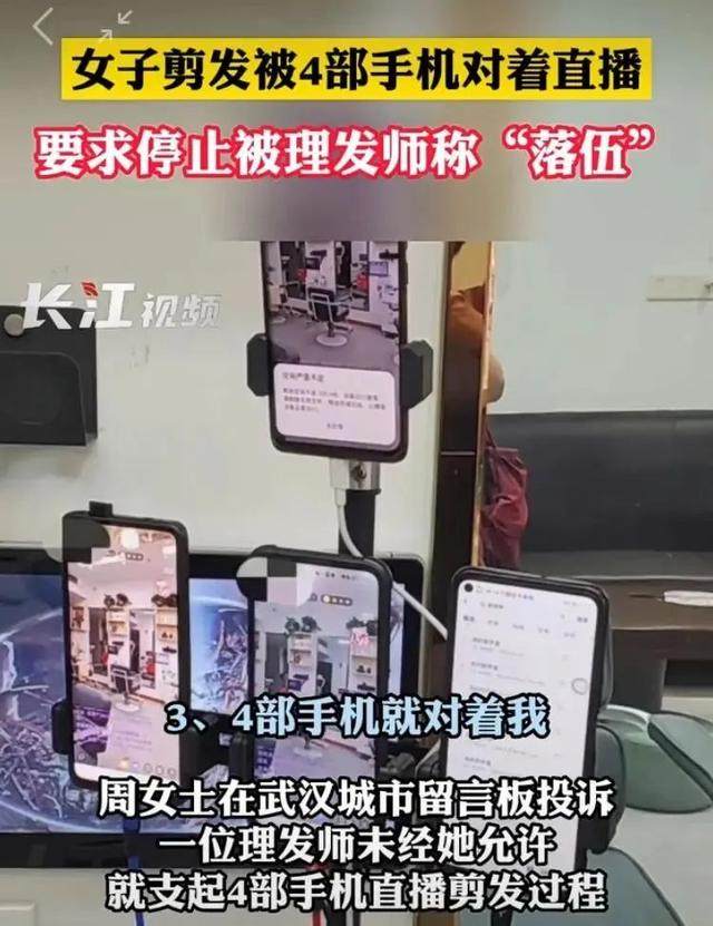 “他用4台手机对着我拍,我不同意,他就说我落伍!”近日,周女士通过武汉城市留言板反映,自己到家附近的理发店剪发时,发现理发师竟在同时用4部手机直播剪发过程。她要求理发师停止直播,对方没有立即移开镜头,还称她“落伍”,“又不是明星,普通老百姓怕啥?”(9月1日《武汉晚报》)