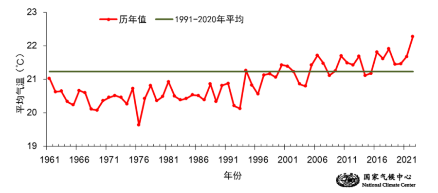 图1 6月1日至8月31日全国平均气温历年变化(1961-2022年)