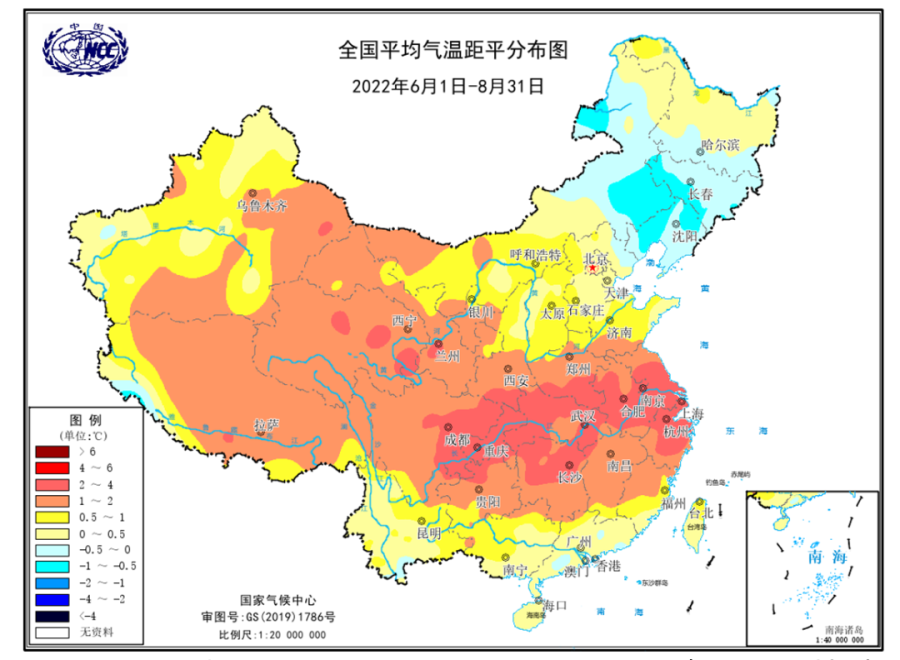 图2 2022年6月1日至8月31日全国平均气温距平分布(单位:℃)