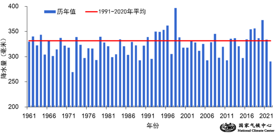 图4 6月1日至8月31日全国平均降水量历年变化(1961-2022年)