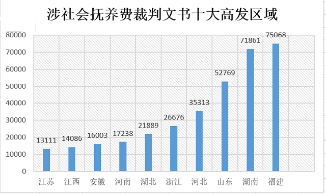 从这38万份裁判文书的涉及地域来看,福建、湖南和山东位列前三,分别是75068、 71861和52769份。第四至十位分别是河北、浙江、湖北、河南、安徽、江西和江苏。