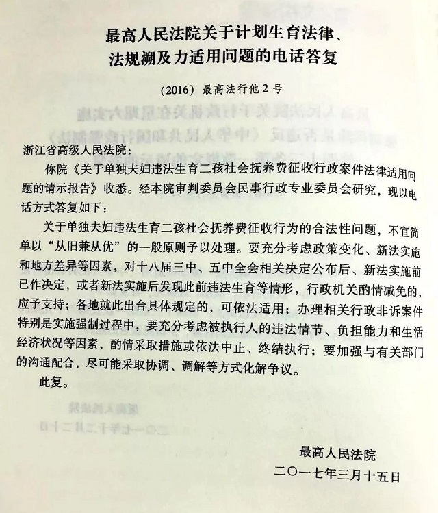 因为此类涉及社会抚养费的行政诉讼案件逐渐增多, 最高人民法院2017年曾专门回复了浙江省高院的一个请示,即《最高人民法院关于计划生育法律、法规溯及力适用问题的电话答复》[(2016)最高法行他2号]。