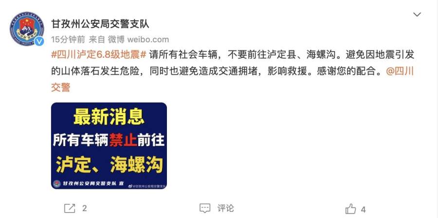 甘孜州公安局交警支队发布提醒:请所有社会车辆,不要前往泸定县、海螺沟。避免因地震引发的山体落石发生危险,同时也避免造成交通拥堵,影响救援。感谢您的配合。