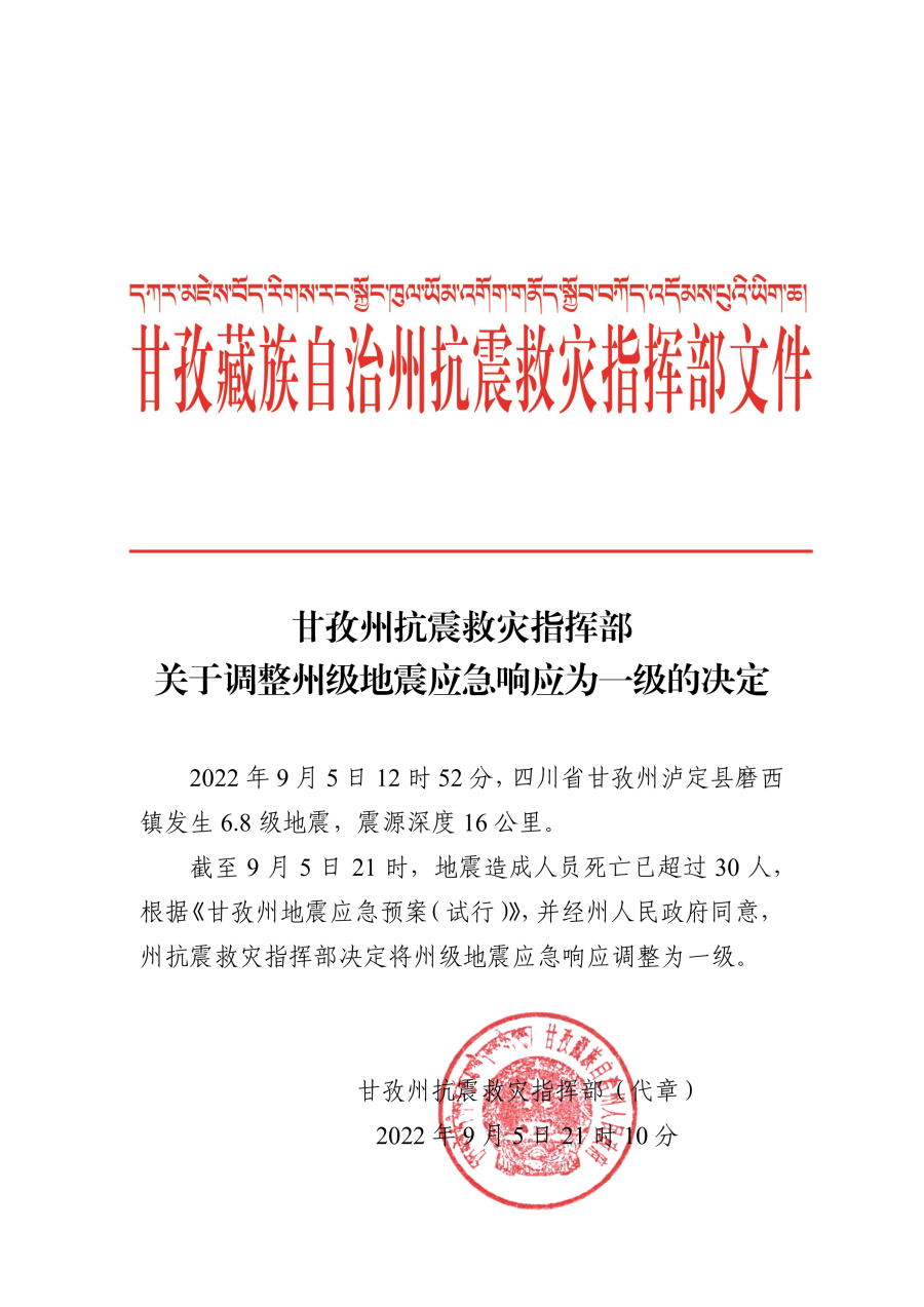 甘孜藏族自治州人民政府网站消息,2022年9月5日12时52分,四川省甘孜州泸定县磨西镇发生6.8级地震,震源深度16公里。截至9月5日21时,地震造成人员死亡已超过30人,根据《甘孜州地震应急预案(试行)》,并经州人民政府同意,州抗震救灾指挥部决定将州级地震应急响应调整为一级。