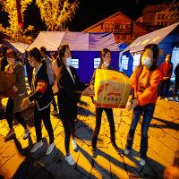 9月5日晚,在四川甘孜州泸定县磨西镇的受灾群众临时安置点,人们在传递救灾物资。 新华社 图