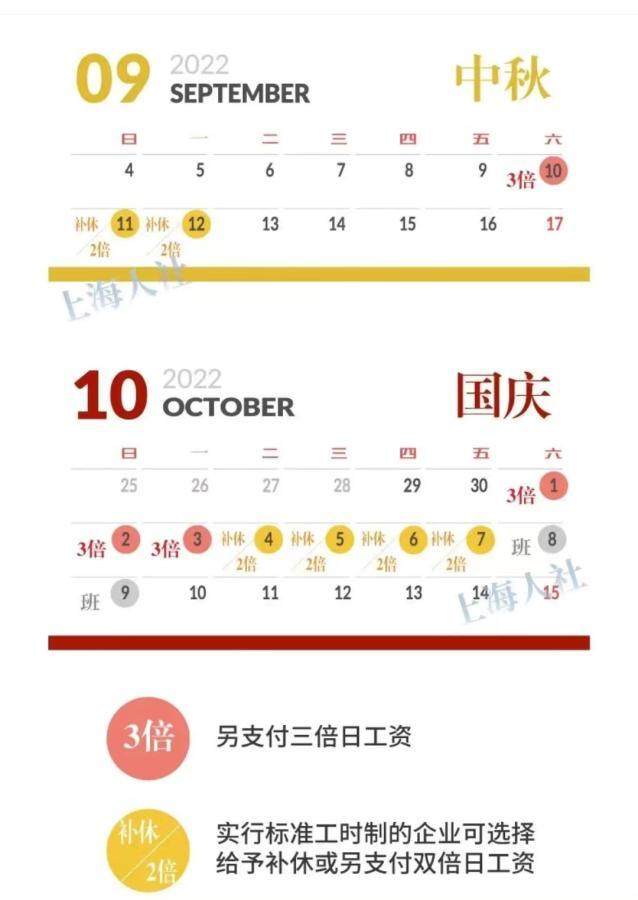 根据多地人社部门明确,9月10日(中秋节)和10月1日、2日、3日(国庆节),这4天是法定节假日,只要安排加班,就应当支付不低于300%工资。9月11日、9月12日,10月4日、5日、6日、7日这6天如果安排加班应先安排补休;不能安排补休的,应当支付不低于200%工资。