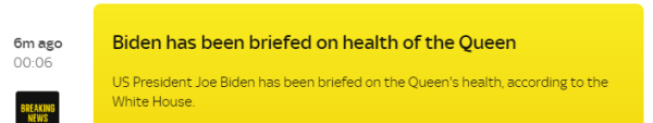 据英国天空新闻网刚刚消息,白宫方面称,美国总统拜登已听取有关英国女王伊丽莎白二世健康状况的简报。白宫称,拜登的心与英国女王及其家人同在。