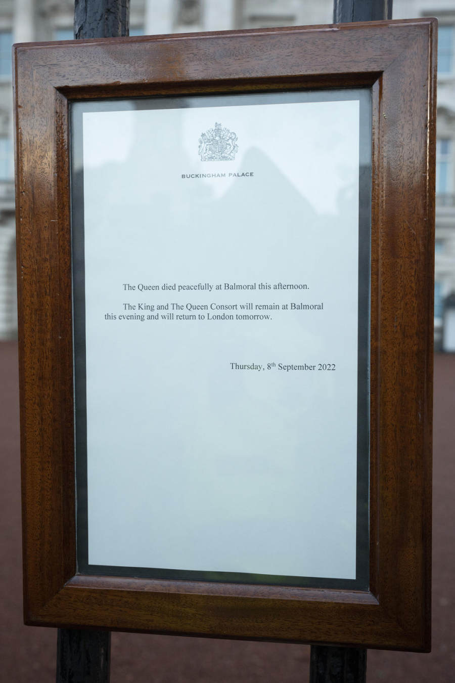 英国当地时间9月8日,一名身着黑色衣服的男仆在白金汉宫的大门上贴了一张官方通告。